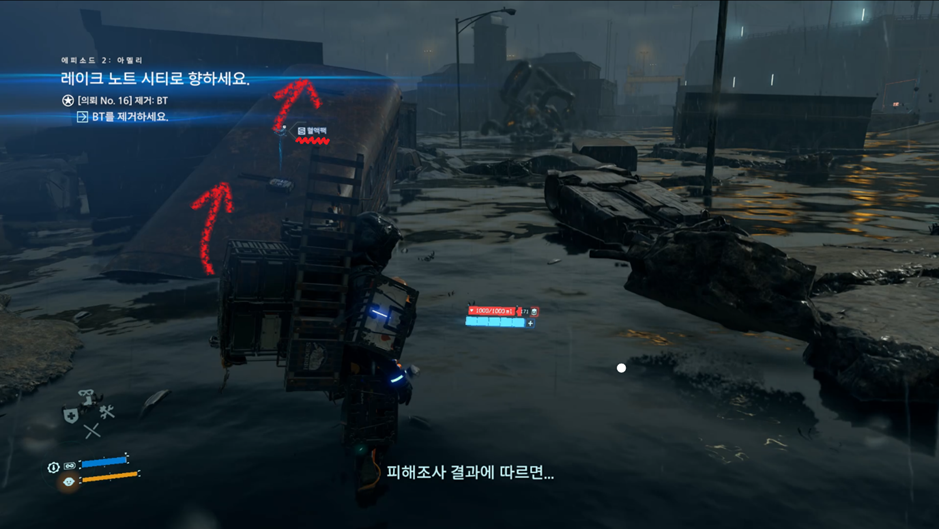 『데스 스트랜딩』은 게임 내에서 아이템 그리고 지형을 이용하여 플레이어를 움직임 혹은 시선을 유도시켜 자신이 선택하여 움직인 느낌을 준다. 처음으로 첫 몬스터(캡처)를 마주한 상황에서 그에 대한 대표적인 예시이다. 위 사진은 컷신 이후 바로 시작된 플레이 화면이다. 기획자는 좌측 위로 플레이어를 이동시키고 싶었을 것이다. 그에 따라 컷신 이후 장면을 바로 올라갈 수 있는 구조물을 형성해놓았으며 혈액팩이란 아이템도 드랍해놓으면서 더 강하게 플레이어를 유도시킨다. 이러한 장치들로 인해 플레이어가 자연스럽게 좌측 고지대 위로 이동하도록 공간을 구성하여, 몬스터와의 *전투 특성(물이 차오르는 저지대 환경)을 통해 직관적으로 공간과 전투를 이해하게 한다.